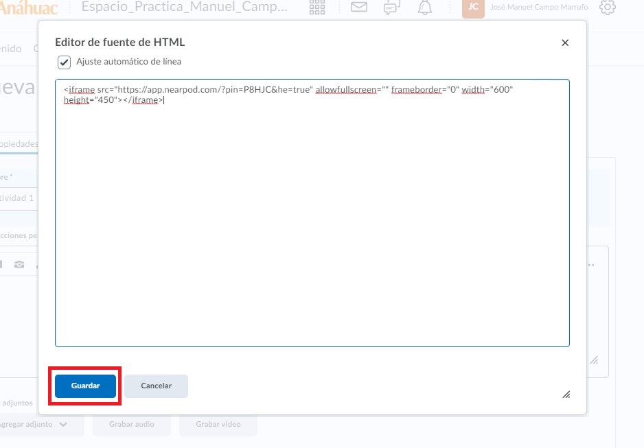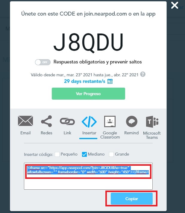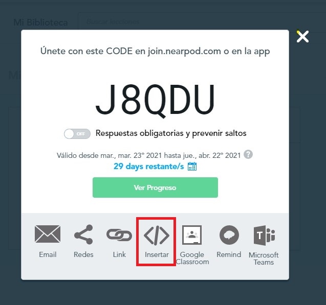 Paso 5. Damos clic en el icono de código de nuestra actividad para que se nos despliegue la ventana en donde incrustraremos el código de nuestro Nearpod.