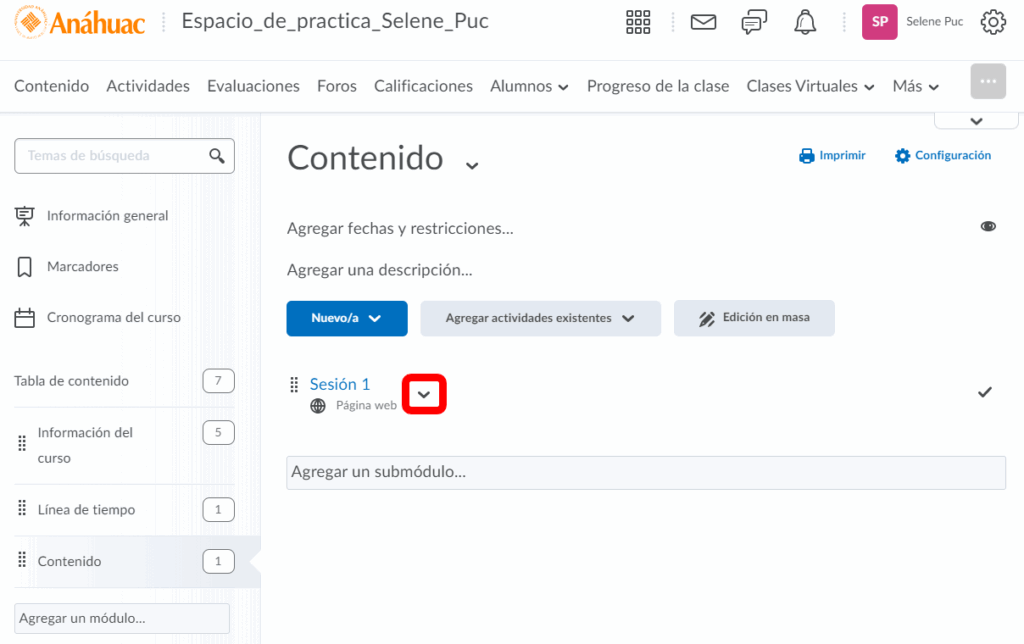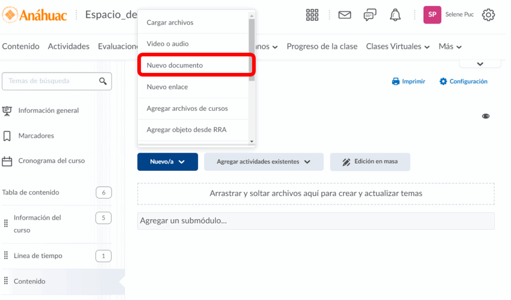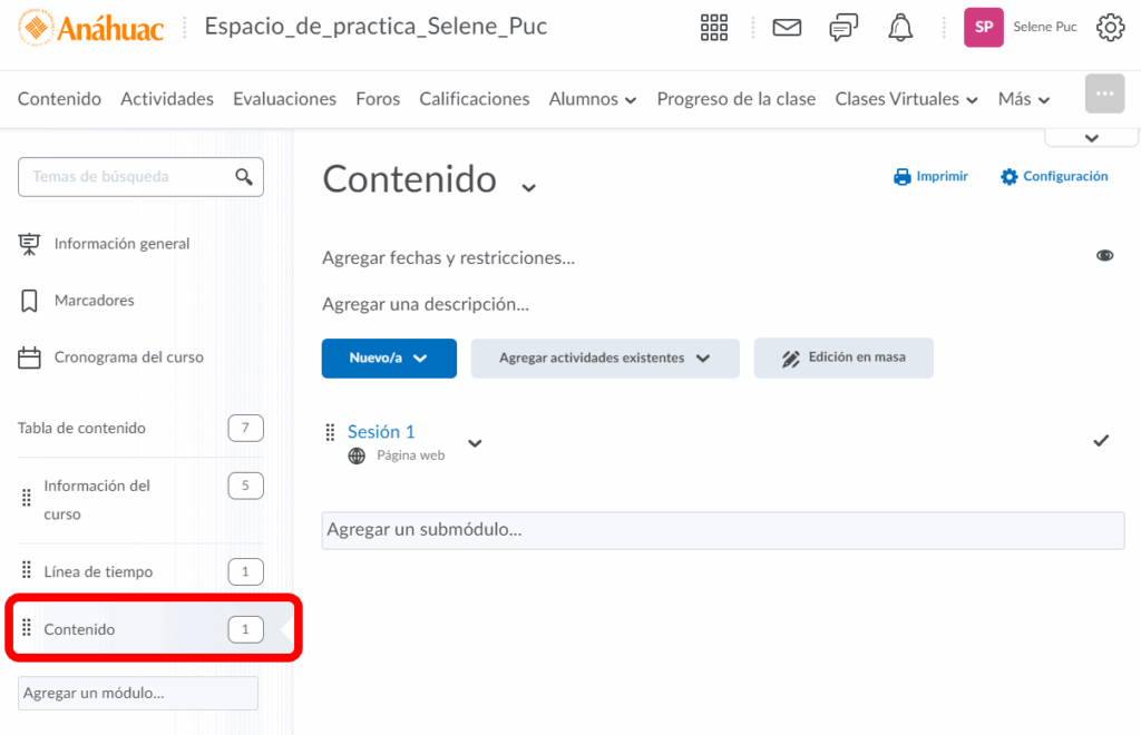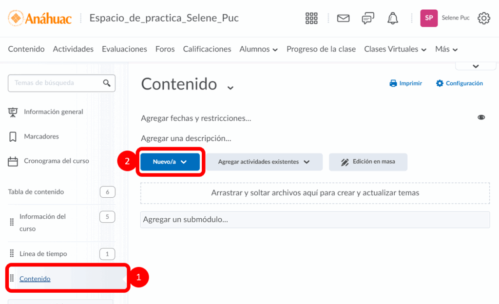Paso 2. Seleccionamos el módulo donde queremos agregar el contenido y da clic en el botón de Nuevo/a.