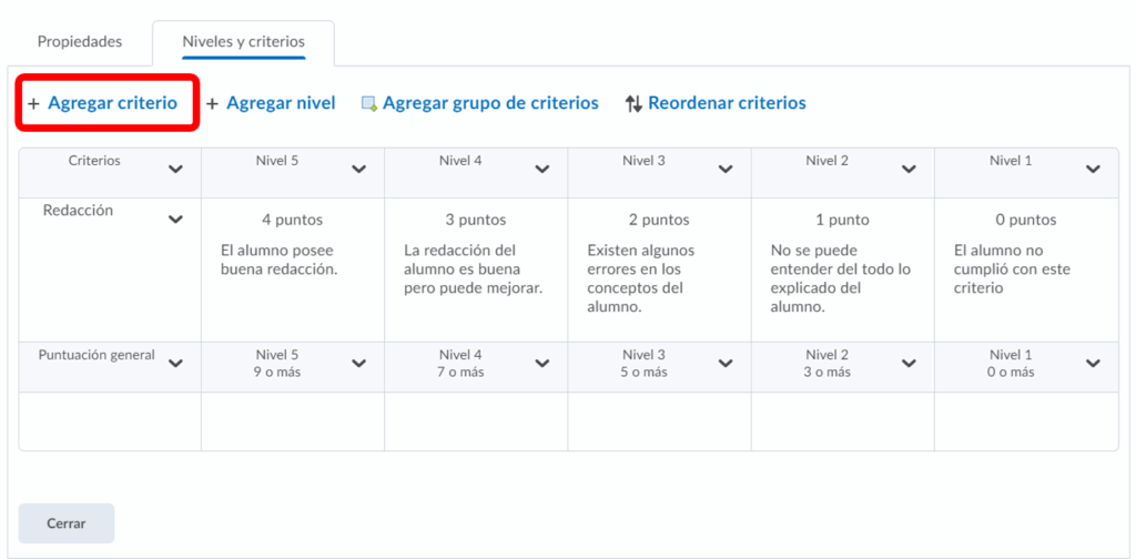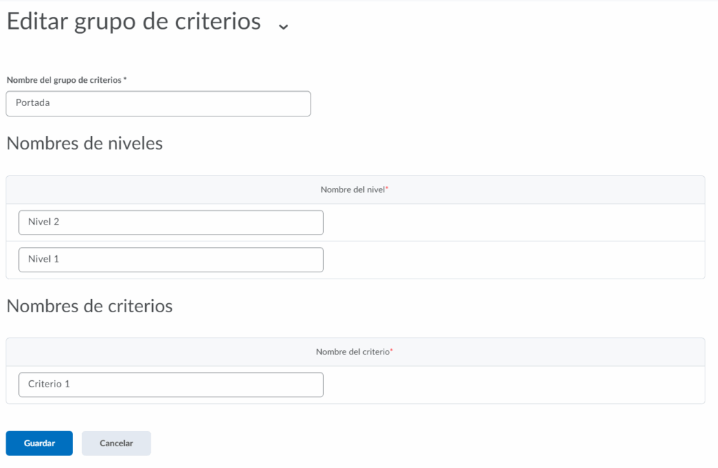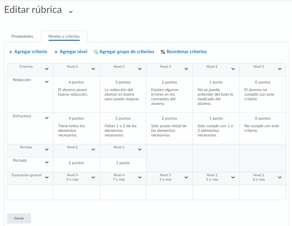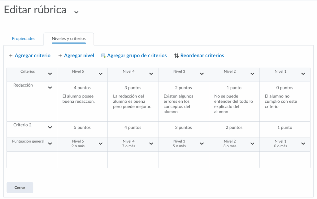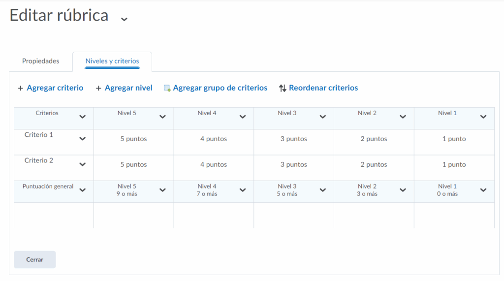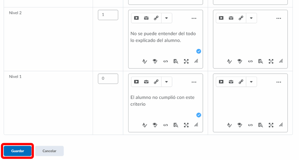 Podremos editar brevemente el nombre de los niveles y los nombres de los criterios, cuando estemos listos presionamos guardar para terminar.