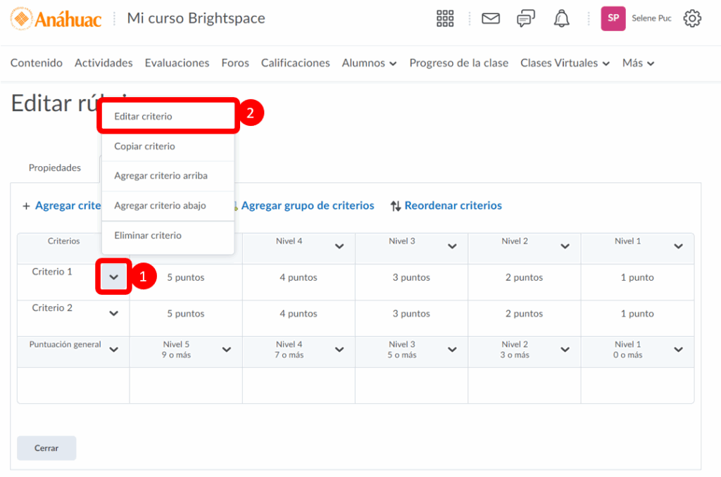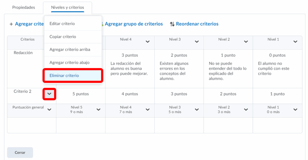 Paso 5. Para editar el nombre del criterio y los puntajes de los niveles debemos de hacerle clic a la flecha al lado del nombre del criterio que deseamos editar y presionar editar criterio.