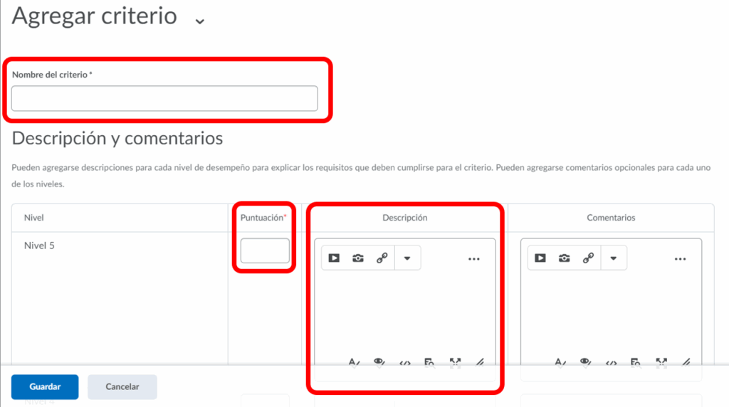 Nos aparecerá la siguiente pantalla donde se tendrá que ingresar el nombre, los valores de la puntuación y la descripción de este criterio con sus debidos niveles.