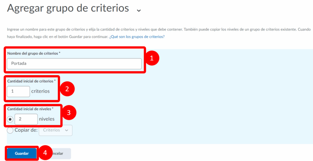 La siguiente pantalla se nos mostrará y tendremos que ingresar el nombre del grupo de criterios, la cantidad inicial de criterios y la cantidad inicial de niveles, al finalizar seleccionamos guardar.