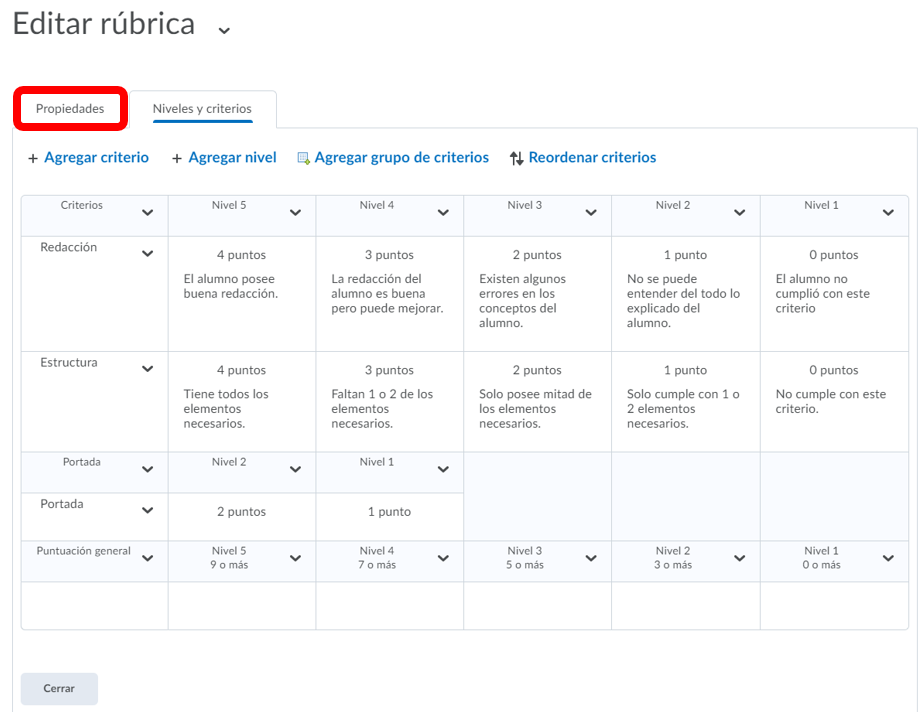 Paso 6. Cuando nos encontremos satisfechos con nuestra rúbrica podremos regresar a propiedades.