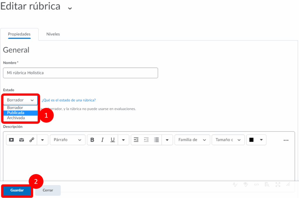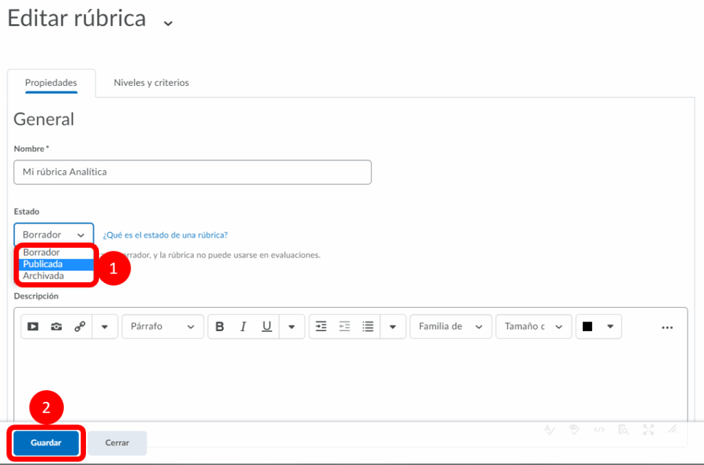 Paso 8. Nos aseguramos que el estado se encuentre en Publicada y guardamos la rúbrica.