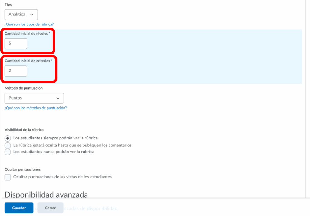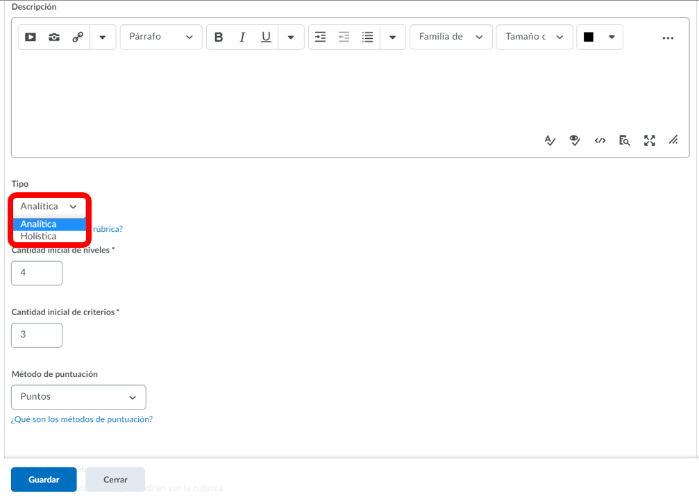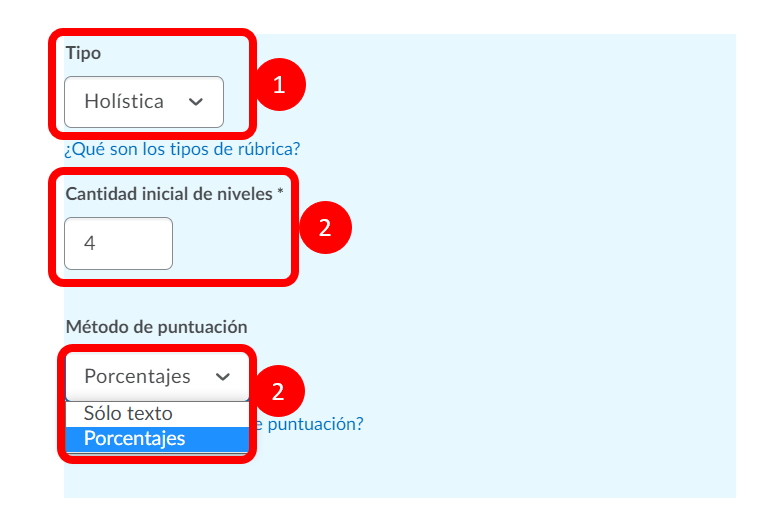 Paso 1. Seleccionamos el tipo de rúbrica como Holística y agregamos la cantidad de niveles que necesitemos. En el método de puntuación poseemos dos opciones: