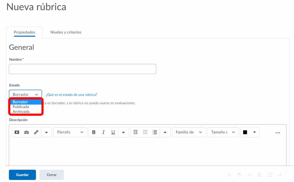Paso 5. Después tendremos que seleccionar que estado tendrá nuestra rúbrica: