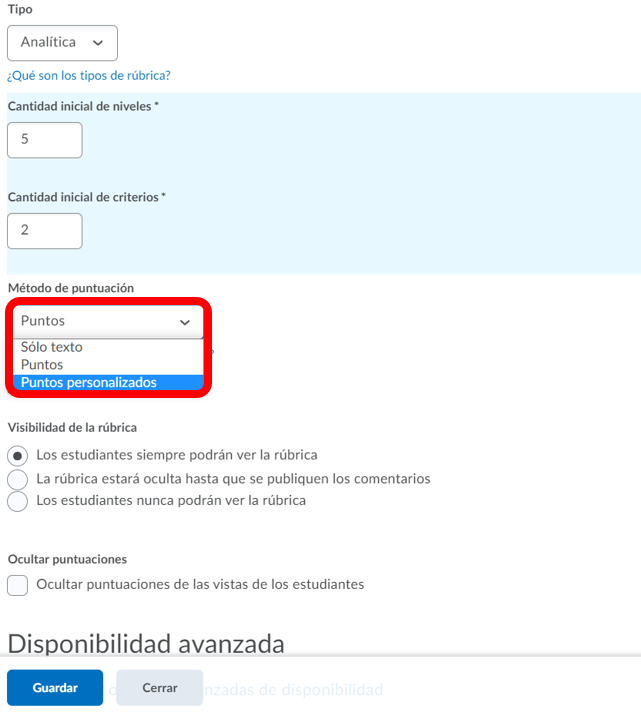 Paso 2. Seleccionamos nuestro método de puntuación, en el caso de las rúbricas analíticas poseemos y tres opciones: