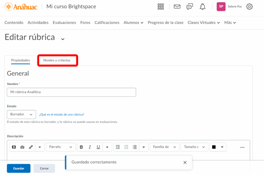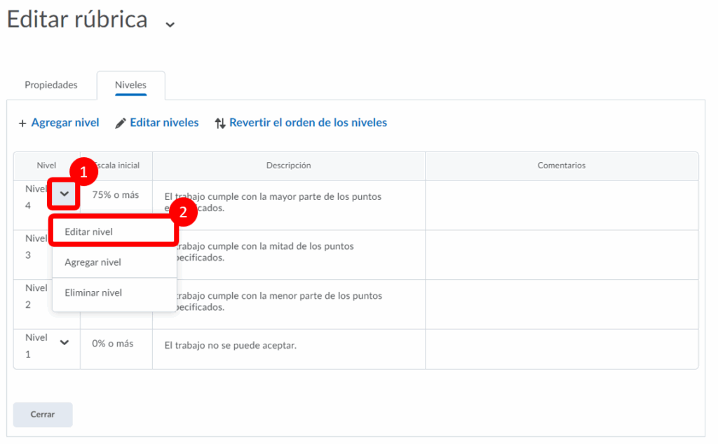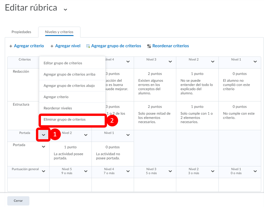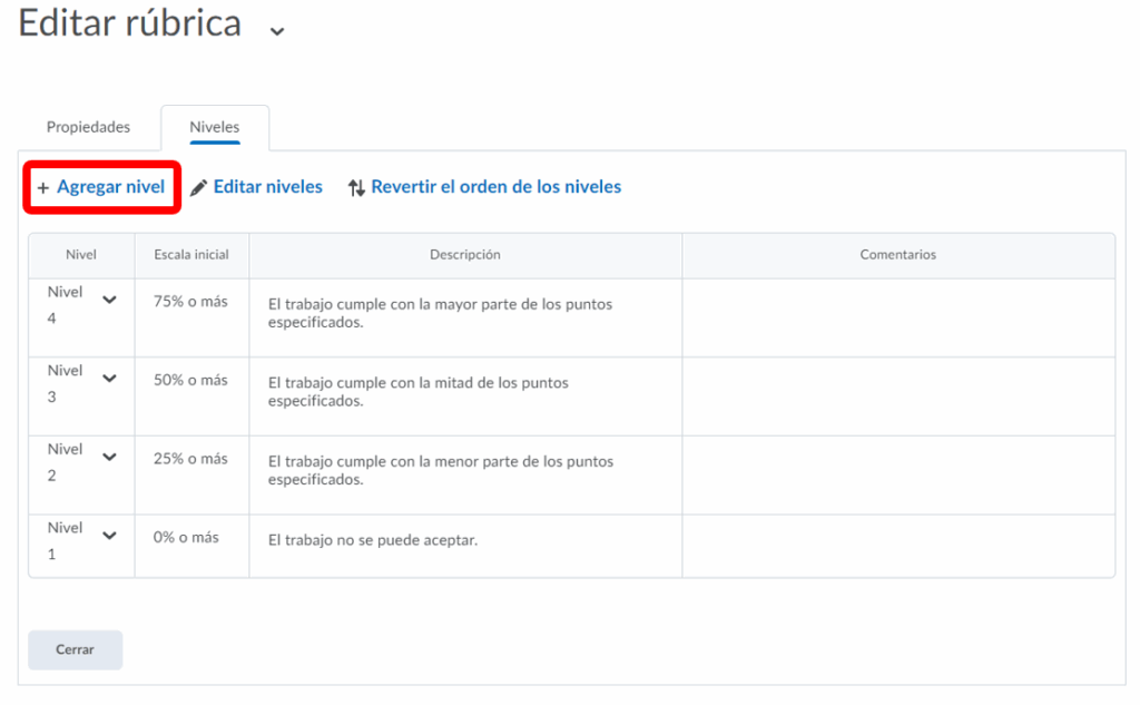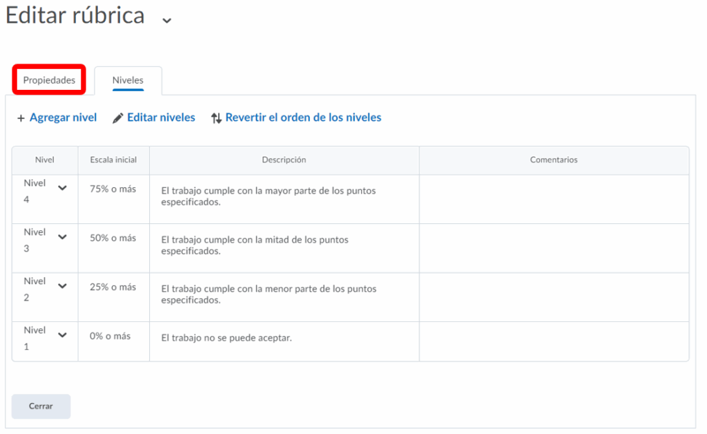 Paso 4. Regresaremos al principio de la página y tendremos que seleccionar Niveles y criterios personalizar la rúbrica.