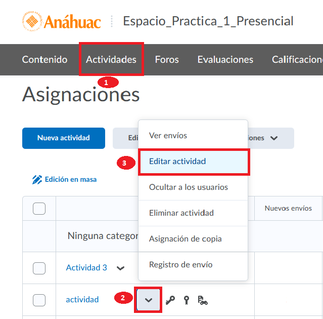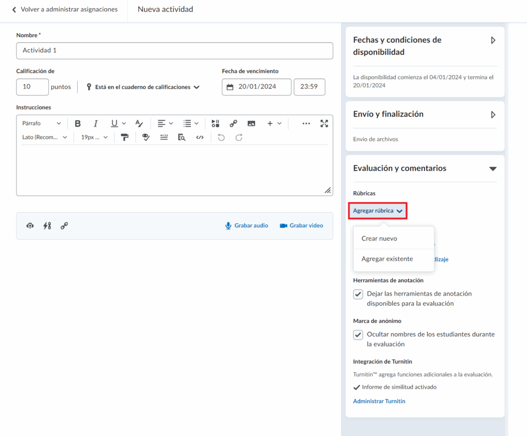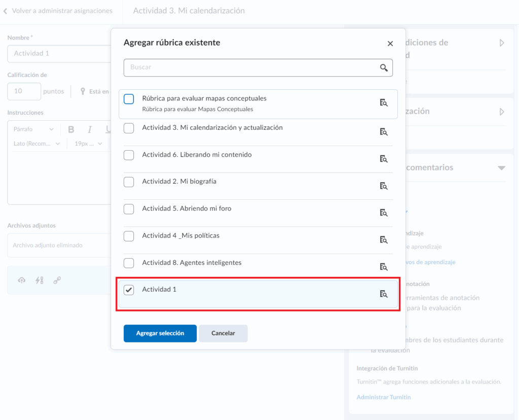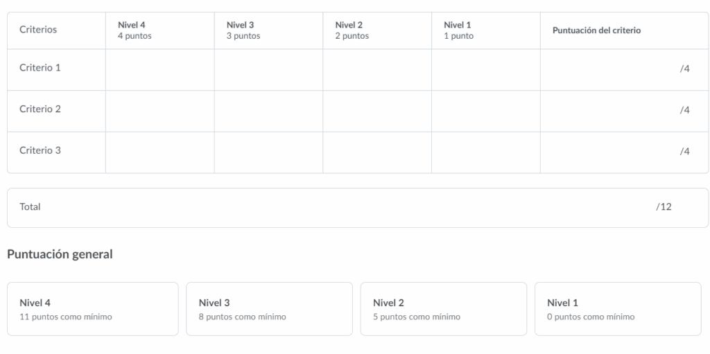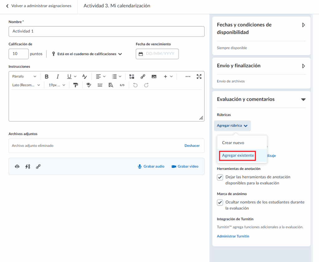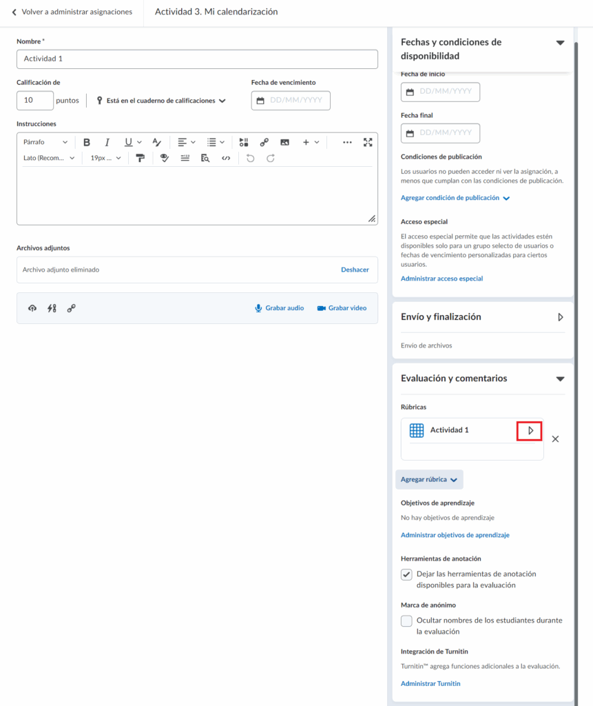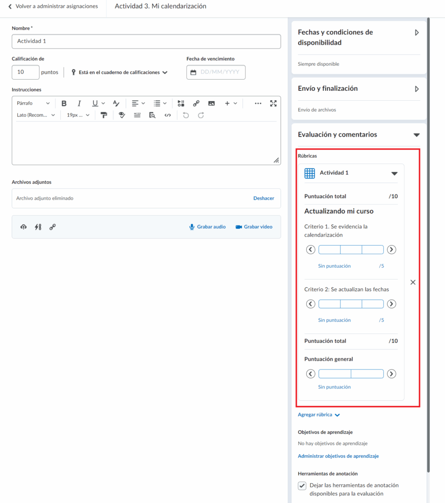 Ahora que hemos identificado cada elemento configurable de la rúbrica, una vez que hemos creado una y ha quedado Publicada, a continuación veremos los pasos para asociarla a una actividad.