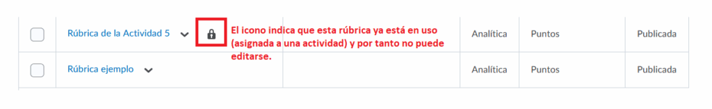 Podremos identificar las rúbricas que están asociadas, porque tienen el icono de un candado.