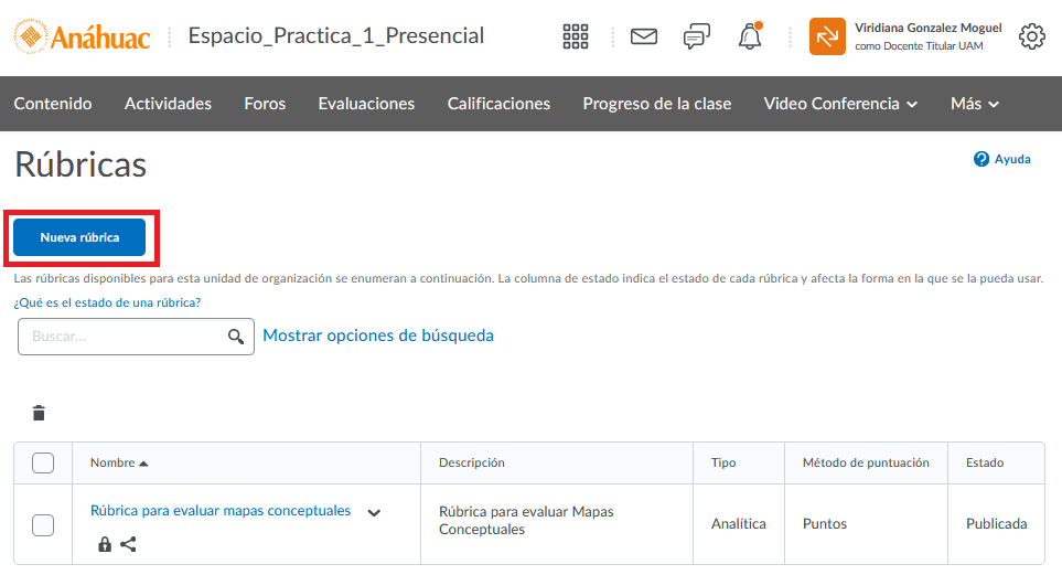 Paso 4. En esta pantalla iremos creando todas las rúbricas que queramos. Damos clic en Nueva rúbrica.