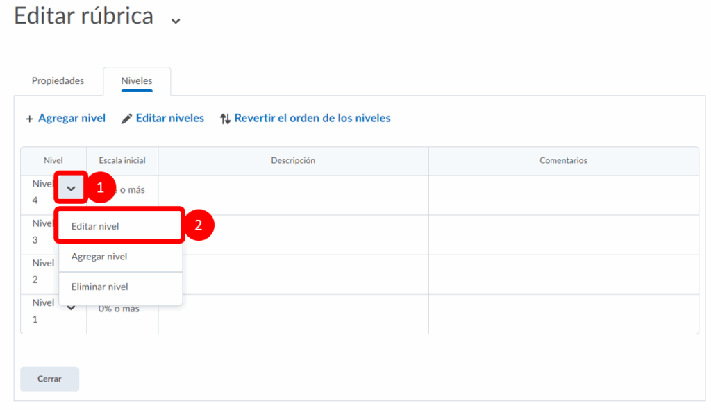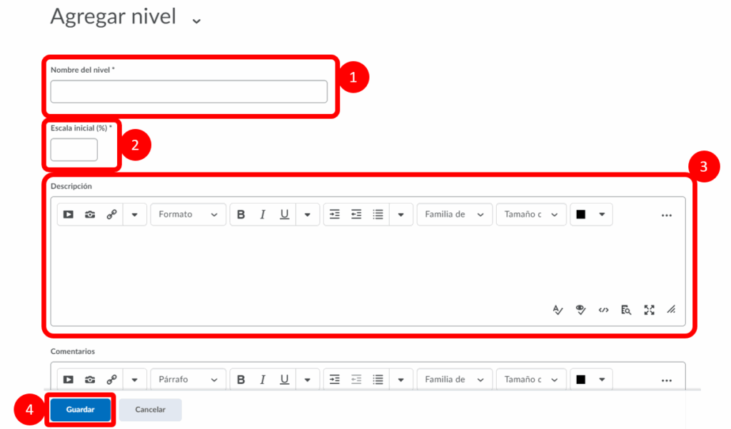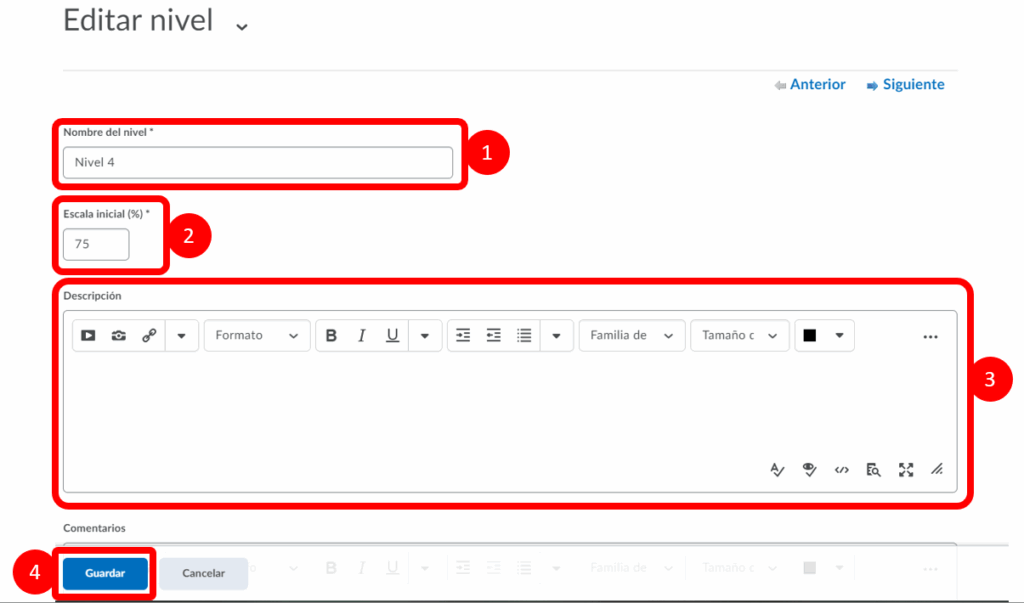 Paso 4. En este apartado podremos editar el nombre del nivel (1), el porcentaje de la escala (2) y la descripción(3). Al finalizar seleccionamos guardar.