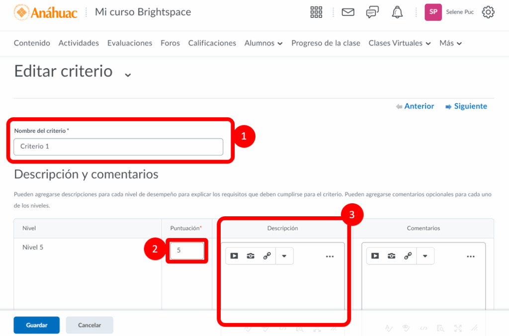Paso 5. Una vez dentro podremos editar el nombre del Criterio (1), cambiar la puntuación de cada nivel contenido en esta sección (2) y agregarle una descripción(3).