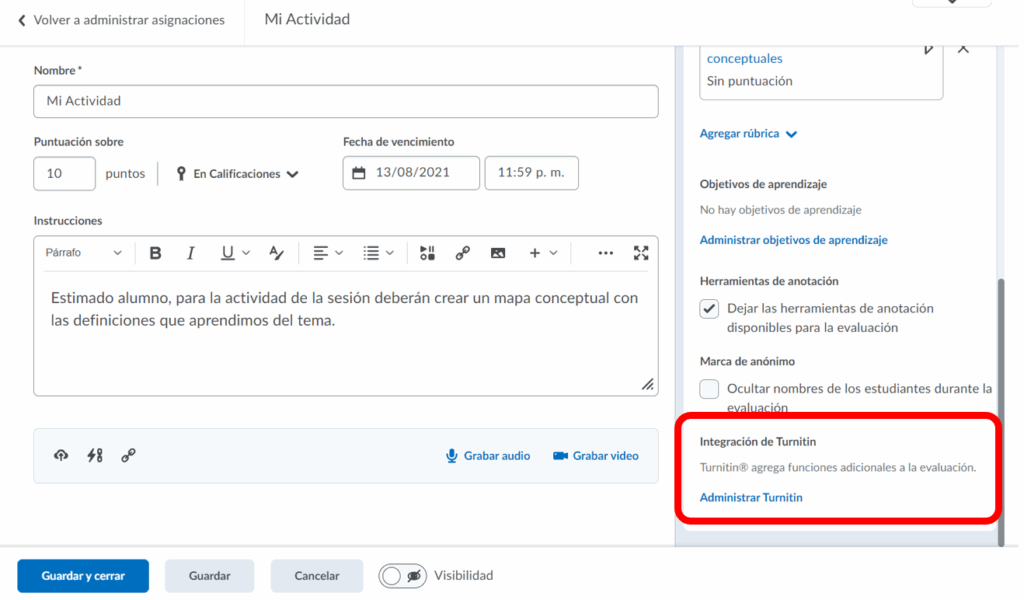 Paso 3. Bajamos hasta encontrar la opción de Integración de Turnitin y hacemos clic en Administrar Turnitin.