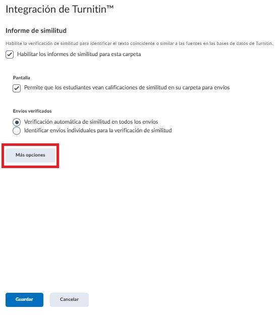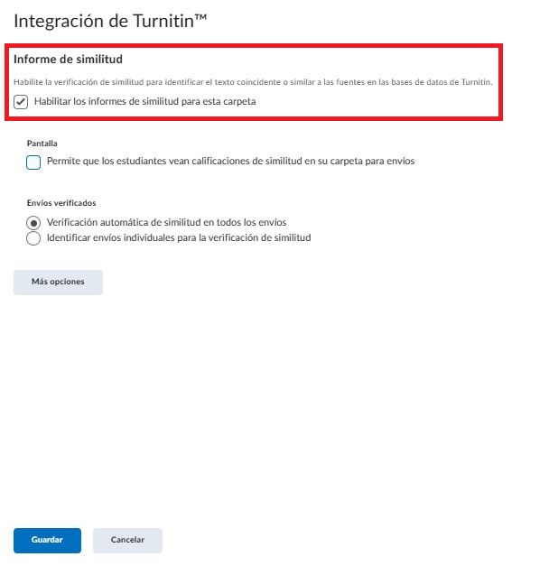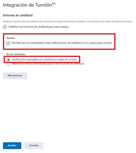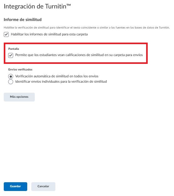 Paso 5. Debemos dar clic en la opción Pantalla: Permite que los estudiantes vean calificaciones similares de Turnitin en su carpeta para envíos. Con ello el Alumno podra revisar si Turnitin le indica la similitud de sus trabajos para que pueda realizar cambios adecuados.