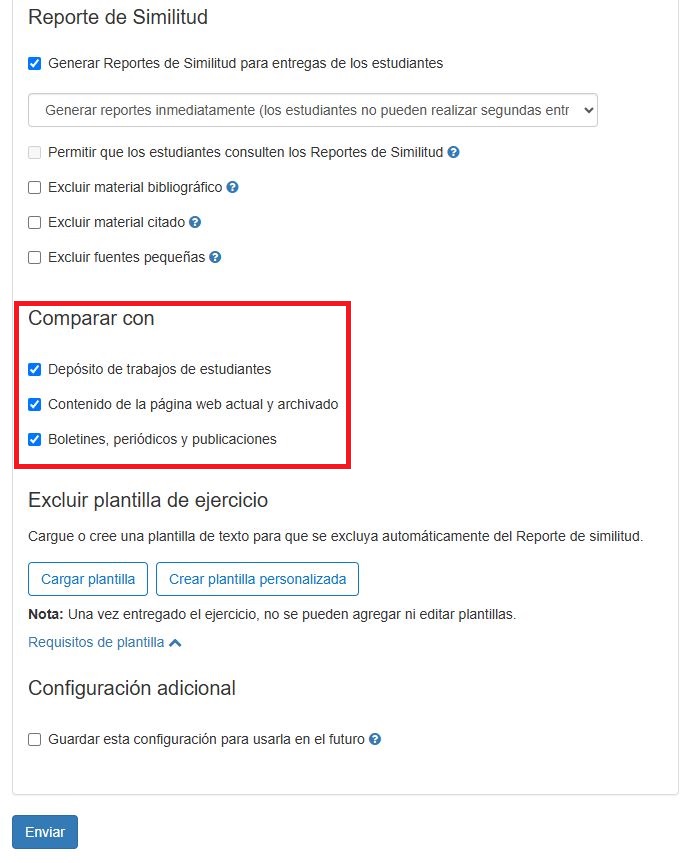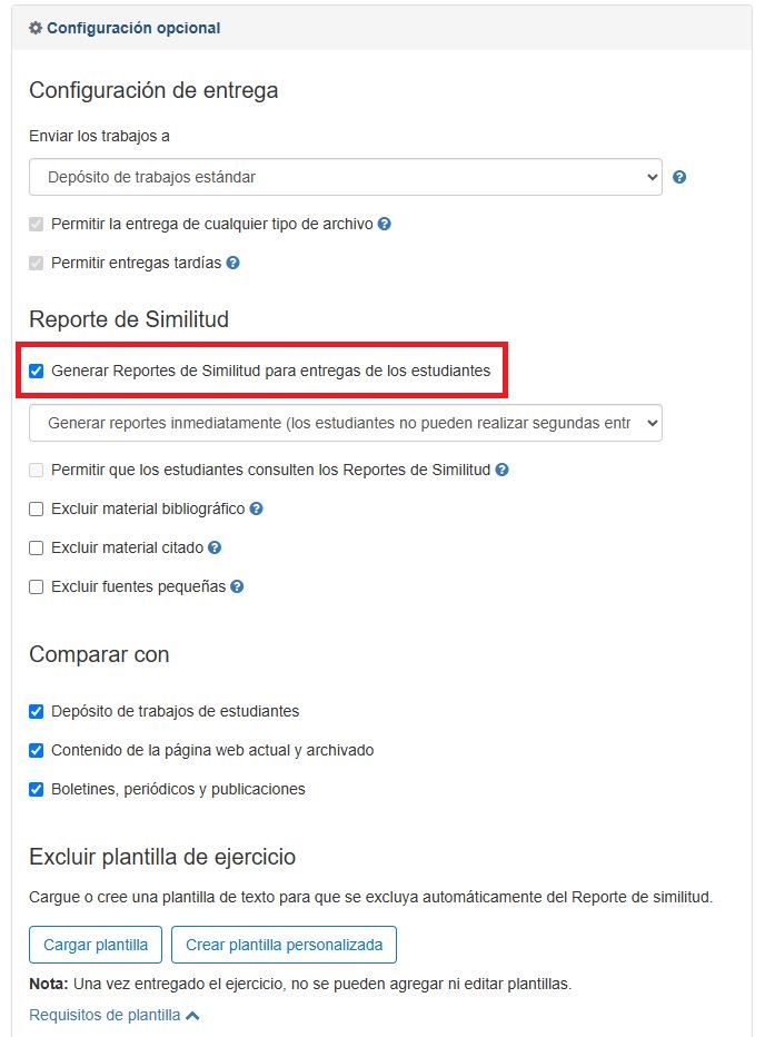 Paso 10. En el Reporte de similitud, se recomienda seleccionar cualquiera de las dos opciones de Generar reportes inmediatamente, ya que es la que nos permite detectar el plagio de forma automática, con lo que podemos evaluar y retroalimentar la actividad antes de la fecha de finalización.