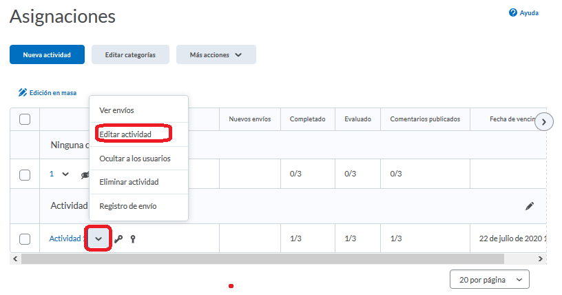 Paso 2. Damos clic en la flecha junto al nombre de la actividad que queremos configurar por secciones. En el recuadro, damos clic en Editar actividad.