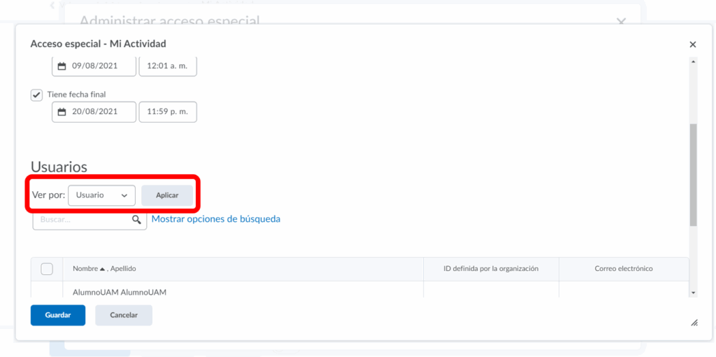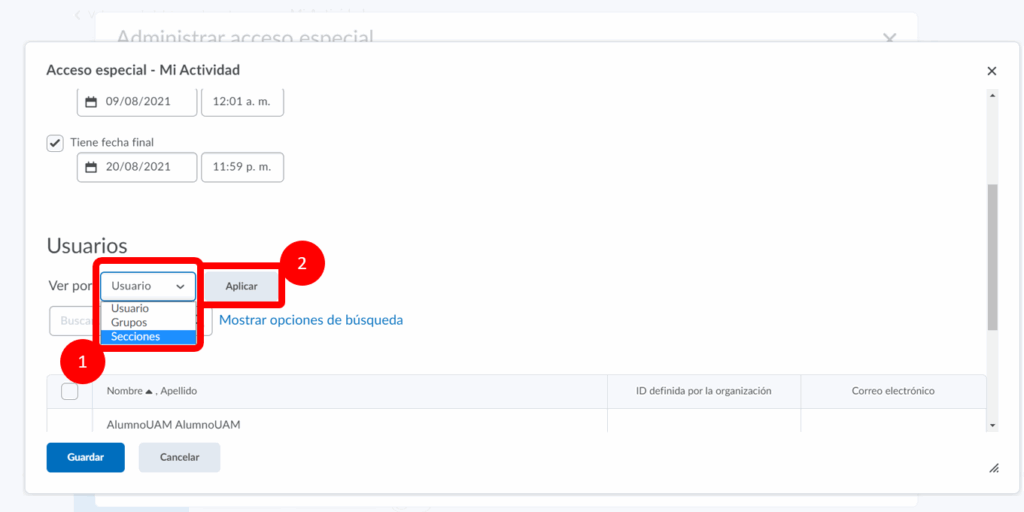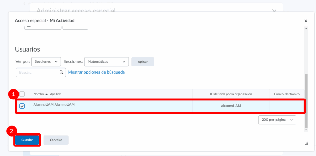 Paso 11. Ahora selecciona a todos los alumnos de la sección. Cuando los hayas seleccionado todos puedes hacer clic en guardar para terminar de editar.