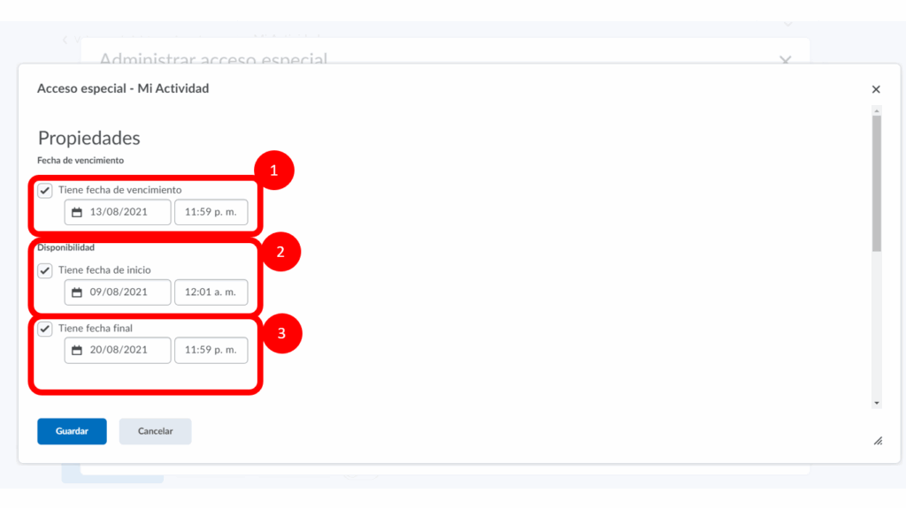 Paso 8. Nos aparecerá una nueva ventana en la cual podremos especificar la fecha de vencimiento, la fecha de inicio y la fecha final para el acceso espacial.