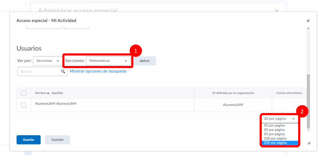 Es importante que antes de seleccionar a los alumnos cambies el número de alumnos que aparecen por página de 20 a 200 para que podamos ver a todos los alumnos de la sección.