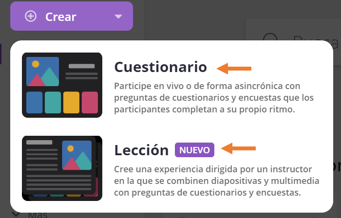 Podrás elegir entre crear un cuestionario y/o una lección.