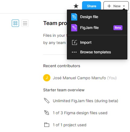 Aquí podremos visualizar todos los espacios de trabajo que tenemos vigentes. Asimismo, si queremos crear un archivo nuevo, del lado superior derecho, damos clic en New y en FigJam file.