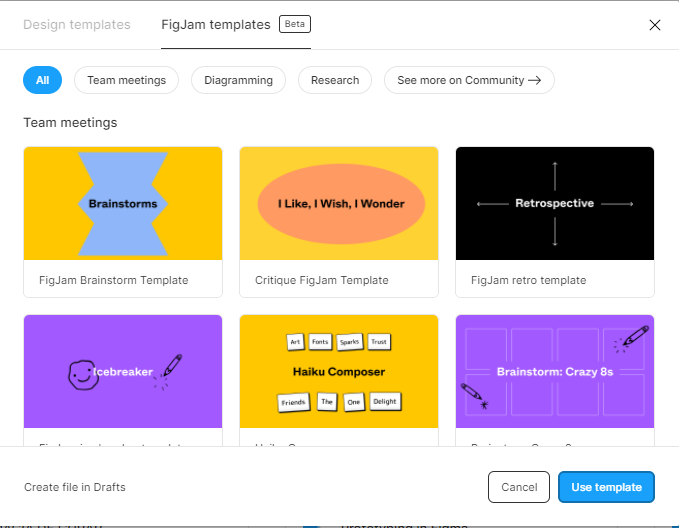 ¡Aprovecha los templates! Asimismo, FigJam te proporciona diferentes templates o formatos ya diseñados que sirven para no empezar desde cero, si no tener un diseño más atractivo y visual en los espacios de trabajo.