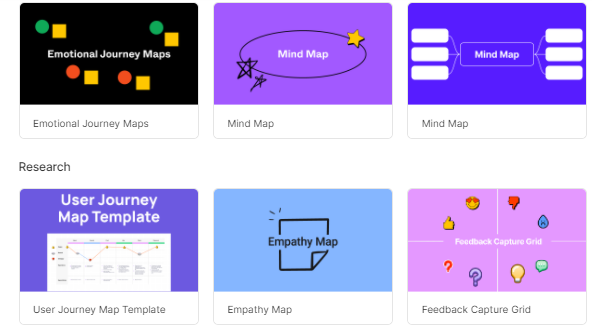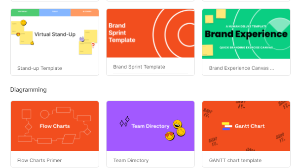 Te aparecerán diferentes tipos de formatos o templates que puedes usar para enriquecer tu lienzo (lluvia de ideas, Gannt, diagrama de flujo, mapa mental, mapa de empatía, Journey map, entre otros formatos).