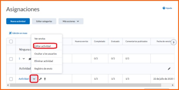 Paso 2. Damos clic en la flecha junto al nombre de la actividad que queremos configurar por secciones. En el recuadro, damos clic en Editar actividad.