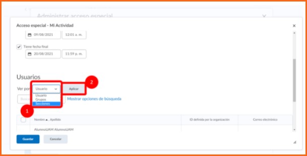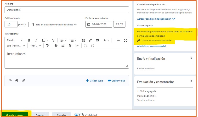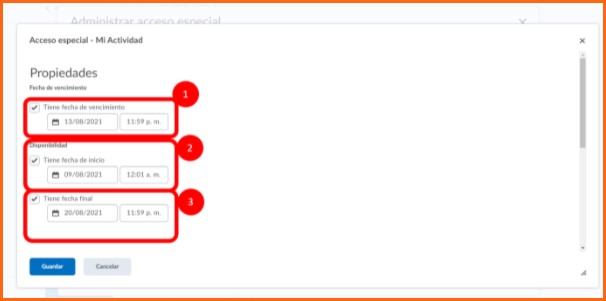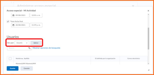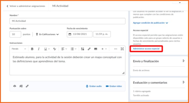 Éste acceso especial sirve para configurar una actividad con fecha de disponibilidad y entrega diferente (adelantarla o atrasarla) a los alumnos que se elijan, sin afectar la fecha original de entrega del resto de los alumnos.