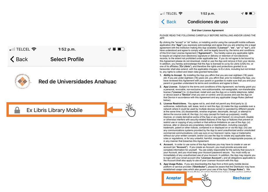 Paso 3. Da clic en Ex Libris Library Mobile. Posterior a ello, en las Condiciones de uso da clic en Aceptar.