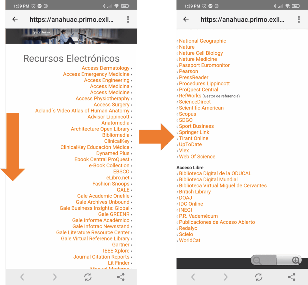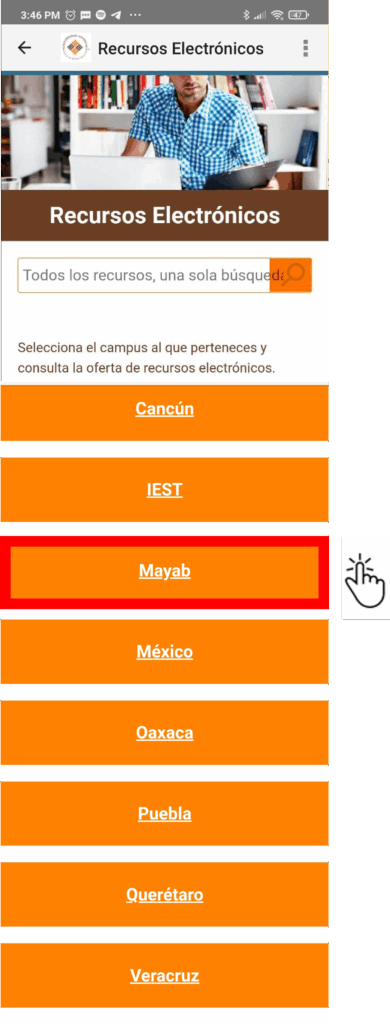 Lo principal de la aplicación es el acceso a las bases de datos de la Biblioteca para buscar tu bibliografía. Si haces clic en la sección que dice ‘’recursos electrónicos’’ deberás elegir el campus al que perteneces.