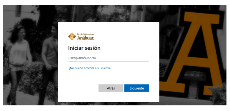 Paso 2: Coloca tu correo y contraseña para iniciar sesión. El acceso es con tu cuenta Microsoft correo @anahuac.mx y tu contraseña.