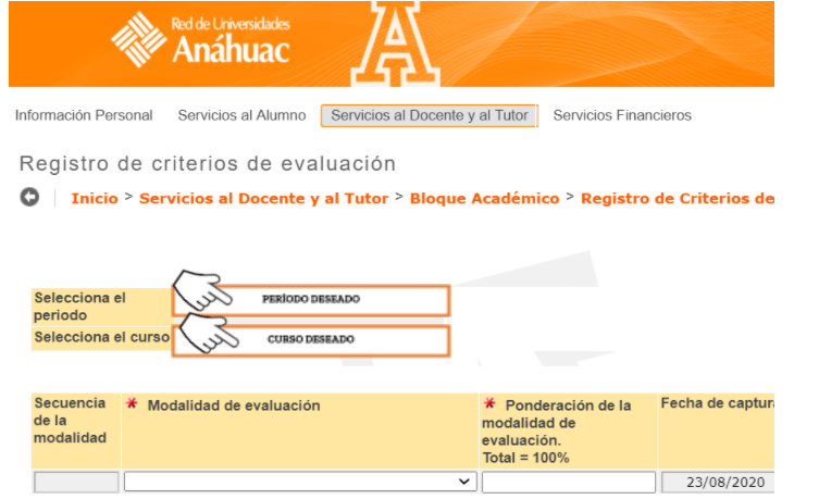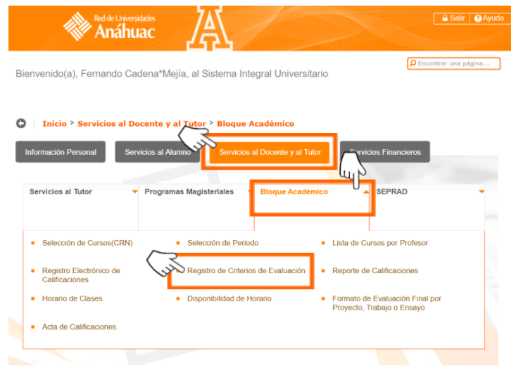 Paso 3: Selecciona la opción Servicios al Docente y al Tutor, elige Bloque Académico y da clic a la sección Registro de Criterios de Evaluación.