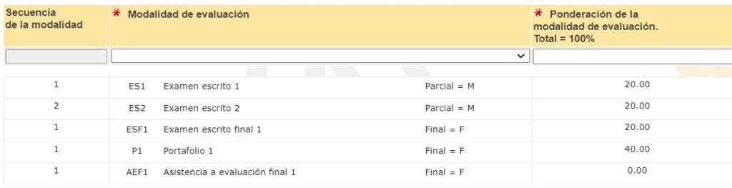 Paso 5: Ahora deberás seleccionar los siguientes criterios para tu materia en línea y asigna el peso correspondiente. Recuerda que estos no son modificables.