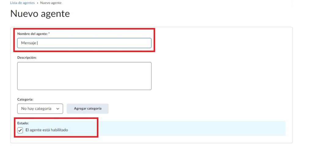 Paso 6. Aparecerá la siguiente pantalla donde configuraremos nuestro Agente Inteligente. Primero podemos agregar el nombre del agente y una Descripción. En estado daremos clic en la casilla El agente está habilitado.