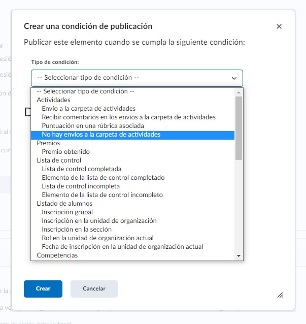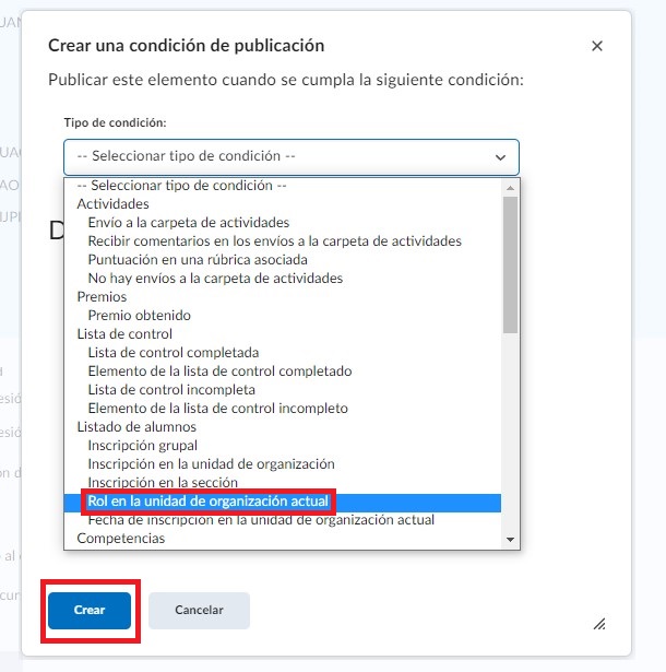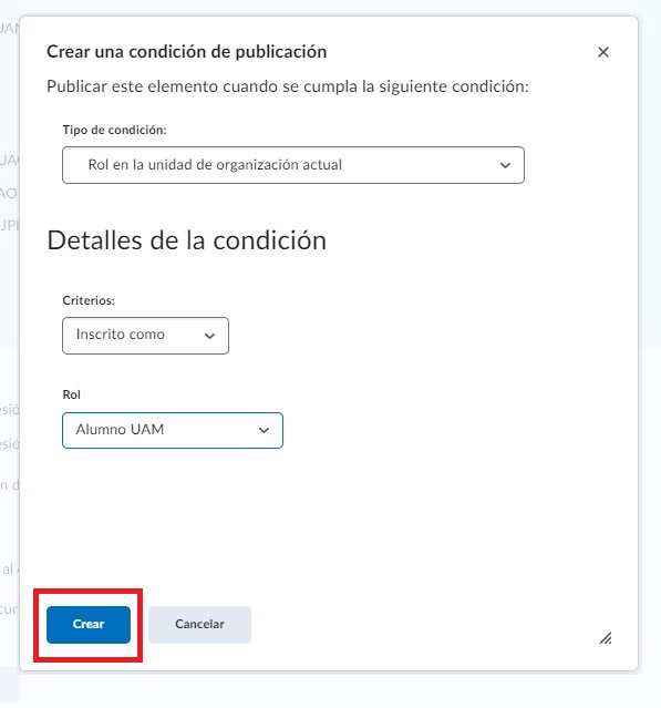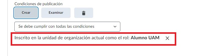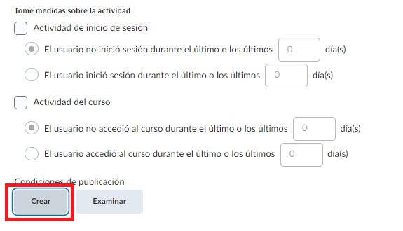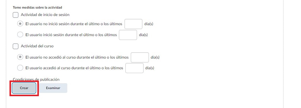 Otras opciones avanzadas se ubican en la sección de ”Condiciones de publicación”. Para crear una condición específica se debe dar clic en Crear
