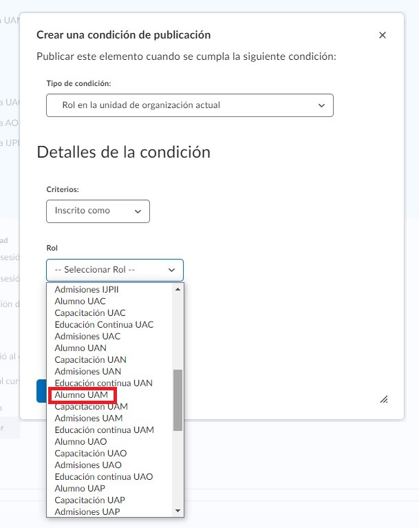 Paso 9. En la sección de Criterios en la opción Rol en el listado de alumnos seleccionaremos Usuarios con roles específicos y posteriormente seleccionamos en Alumno UAM.