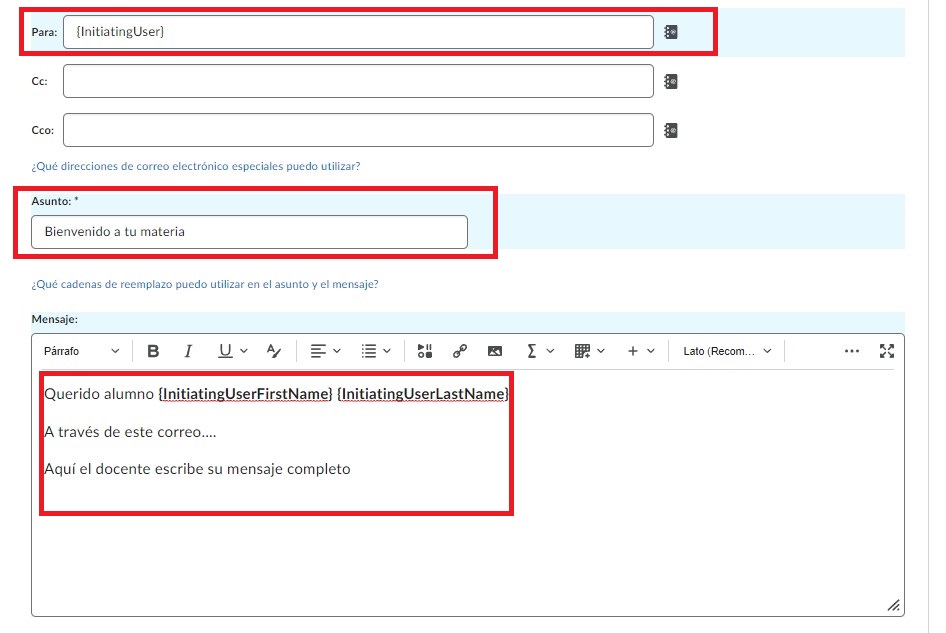 Esto hará que se se conecten ambas cadenas y que se envíe a cada usuario comenzando automáticamente con su nombre y apellido. ¡De esta manera será totalmente personalizado!