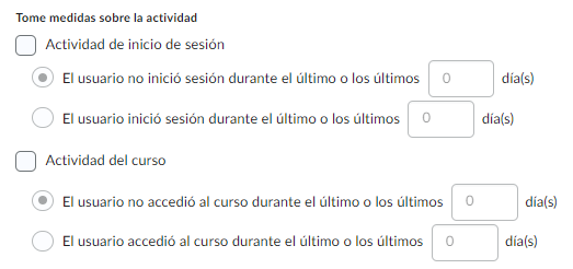 Al activar las opciones que se ven en la siguiente imagen, puede mandar recordatorios cuando el usuario no haya iniciado sesión después de ”x” días, o no accedió al curso en los últimos ”x” días.