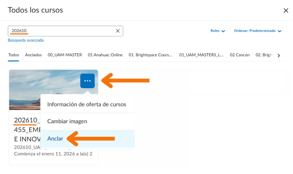 Paso 4. Podemos anclar los cursos, esto nos ayudará a encontrarlos de una forma más sencilla para futuras ocasiones. Para eso, colocamos el cursor encima de uno de los cursos, damos clic a los 3 puntos, y elegimos la opción de anclar.