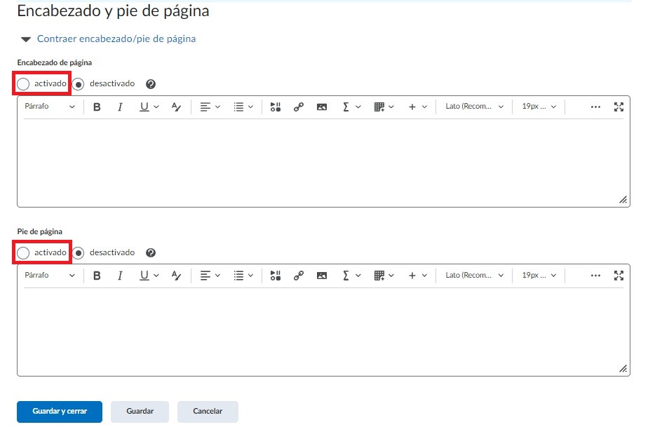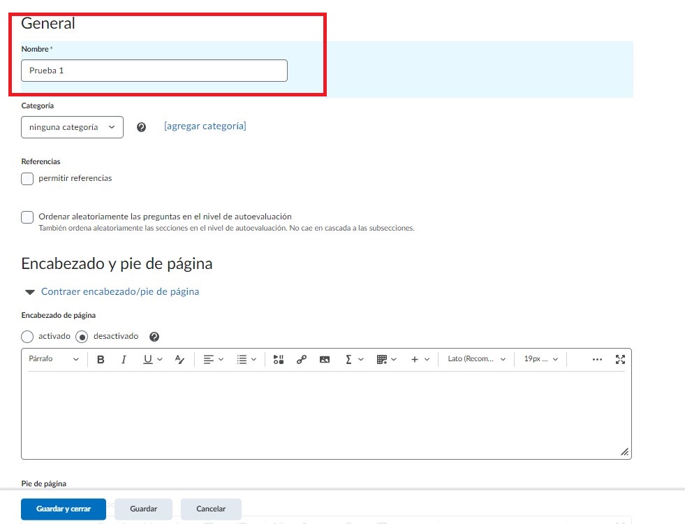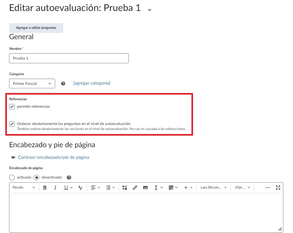 Posteriormente podemos escribir un Encabezado y un Pie de página para la evaluación, dando clic en activado en cada una de las casillas, de momento las dejaremos sin marcar.