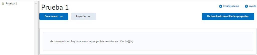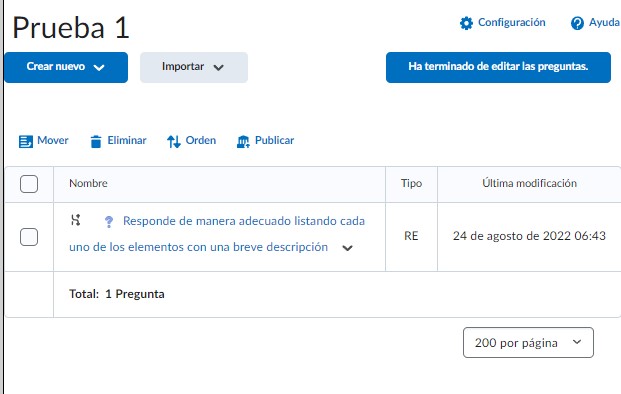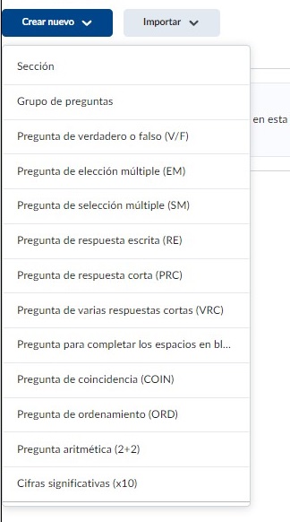 Este menú es parecido al espacio de nuestro Banco de preguntas. Si bien, podemos importar preguntas que hayamos creado en nuestra biblioteca de pregunTas, debemos recordar que el propósito de nuestra Autoevaluación, es que el alumno valide su conocimiento, por lo tanto, no recomendamos emplear las mismas preguntas que emplea en los quizzes, parciales y ordinarios, para no dar al alumno un adelanto de la prueba que sí tendrá un peso en su calificación final. Por lo tanto, crearemos nuevas preguntas que puedan ayudar al estudiante a validar el tema de la materia de forma concreta.