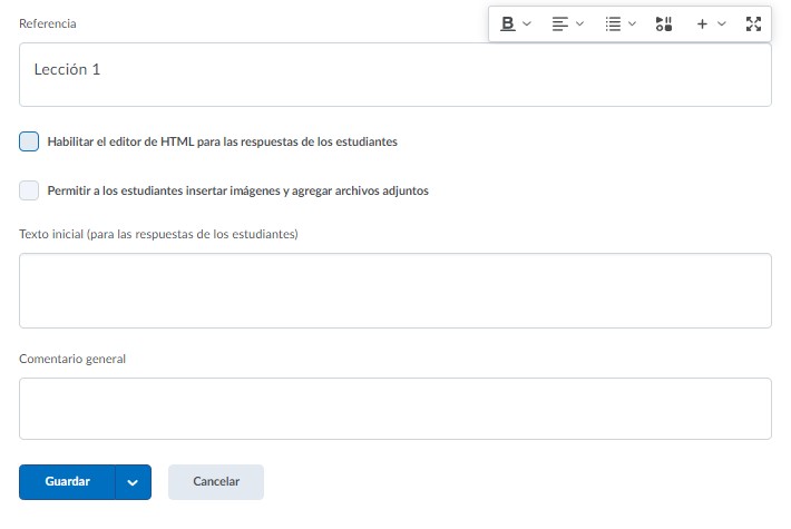 Podemos habilitar la opción del editor de HTML para las respuestas de los estudiantes y Permitir a los estudiantes insertar imágenes y agregar archivos adjuntos