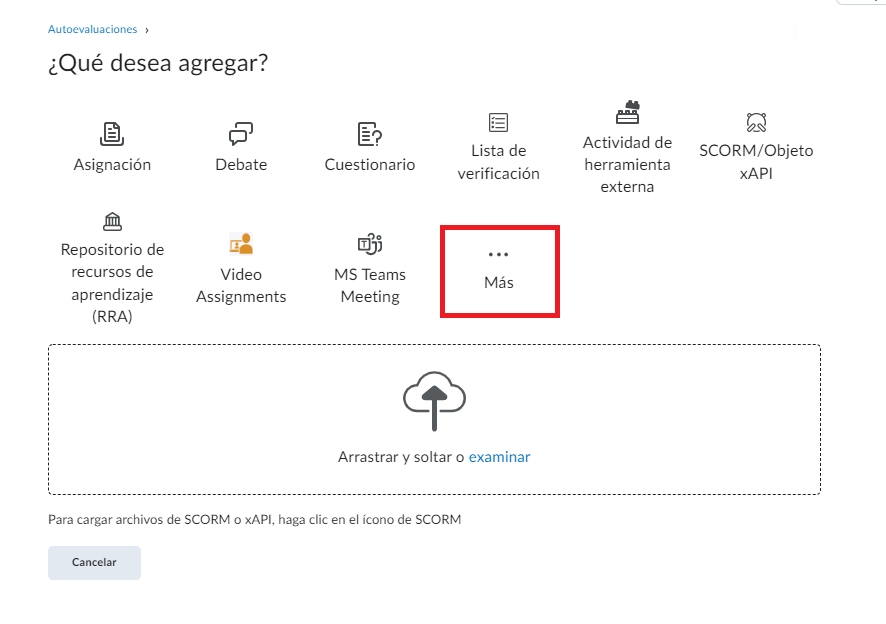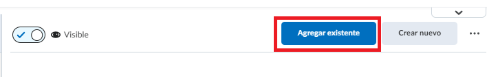 Seleccionamos el espacio donde queremos agregar nuestra Autoevaluación y damos clic en Agregar existente, damos clic en Más De esta forma los alumnos tendrán acceso a la Autoevaluación de forma adecuada.