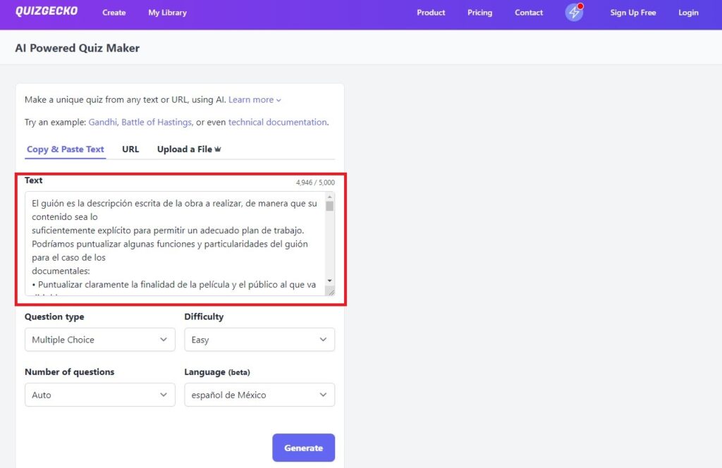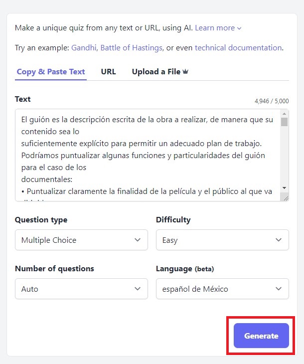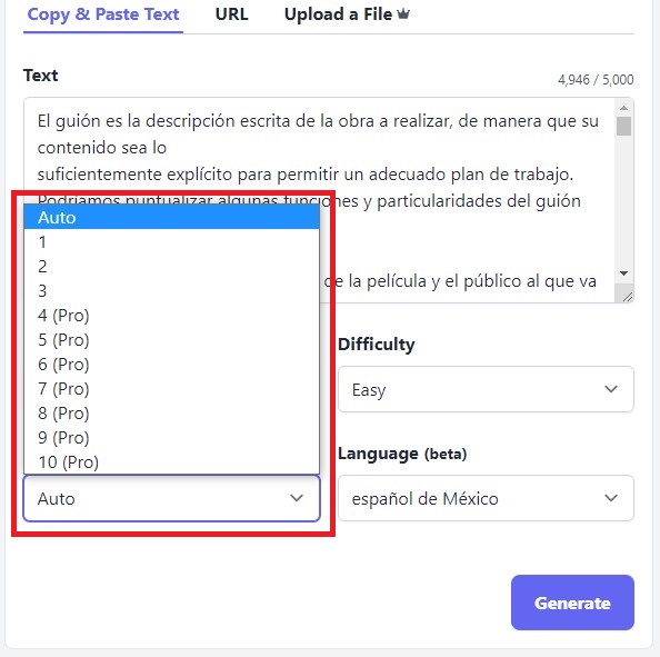 • Si queremos generar quizes de un texto mayor de 5000 caracteres, debemos contar con una cuenta Pro.