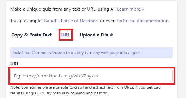 Paso 3: Si lo que queremos es hacer un quiz con base en una página web, damos clic en la opción URL.