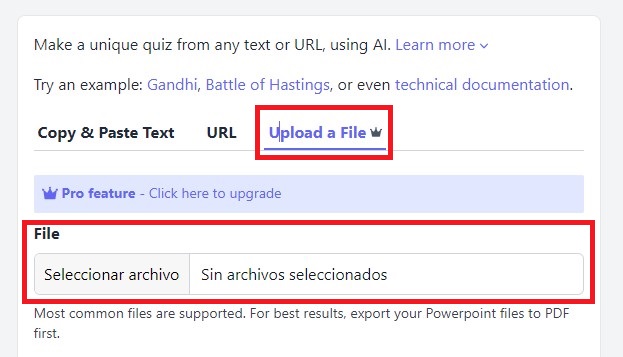 Paso 4: Si deseamos cargar un documento para generar nuestro quiz, damos clic en Upload a File (esta funcionalidad no entra en la versión gratuita sino en la versión Pro).
