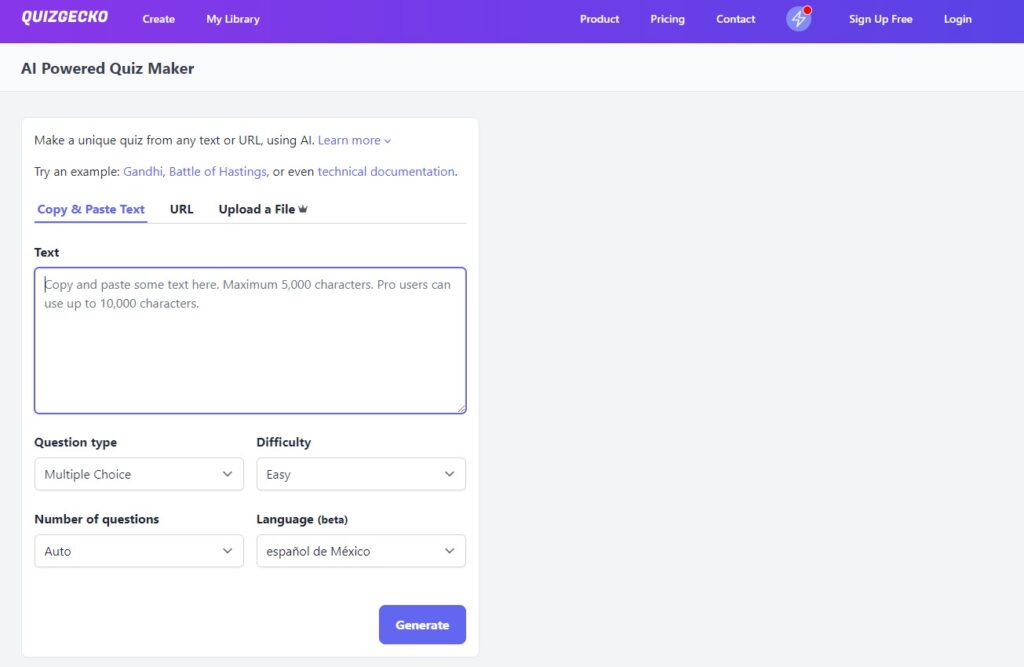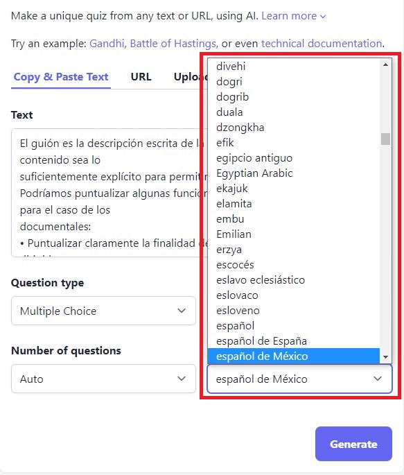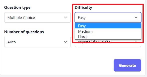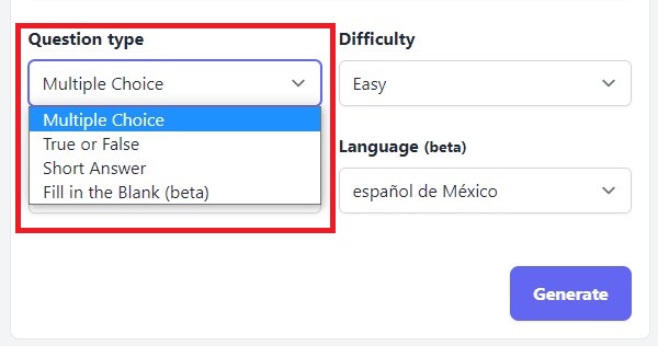 • Versatilidad de quizzes: Puedes seleccionar el tipo de pregunta (selección múltiple, verdadero o falso, respuesta corta y rellenar espacios en blanco) dificultad y el lenguaje, pudiendo crear evaluaciones para diversos idiomas en caso de ser necesario.