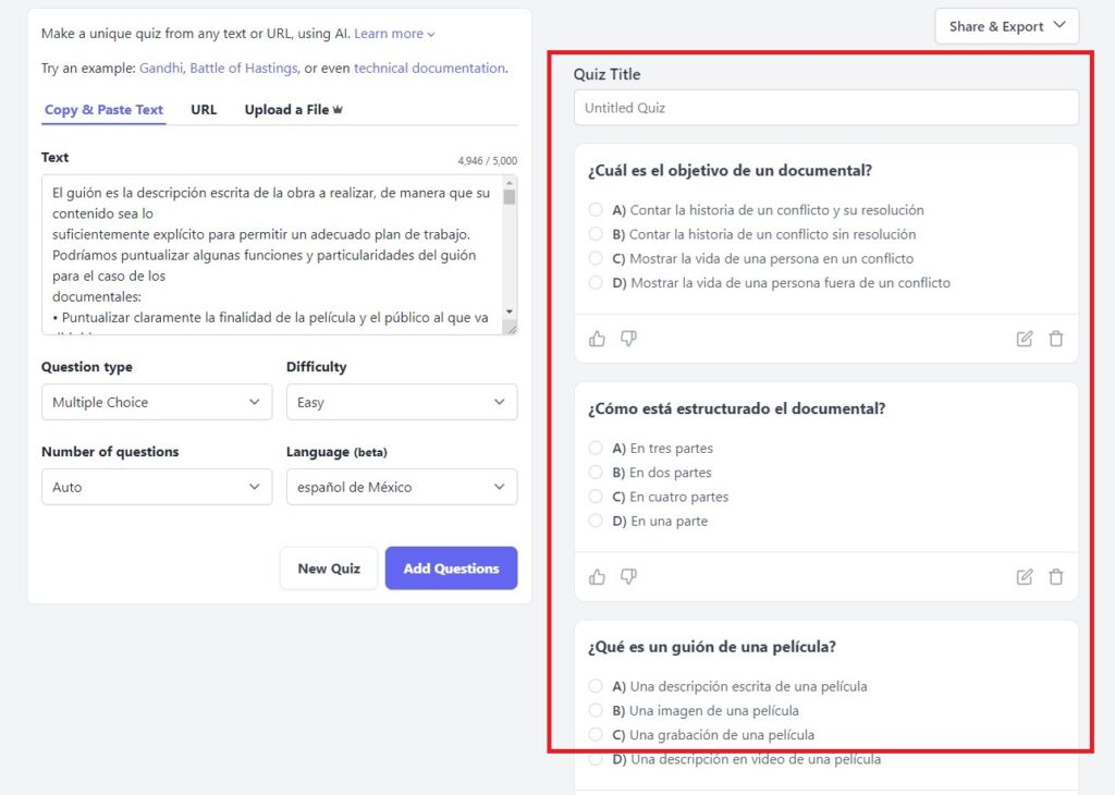 Listo, ya podemos generar quizzes de nuestrsos textos de manera rápida.